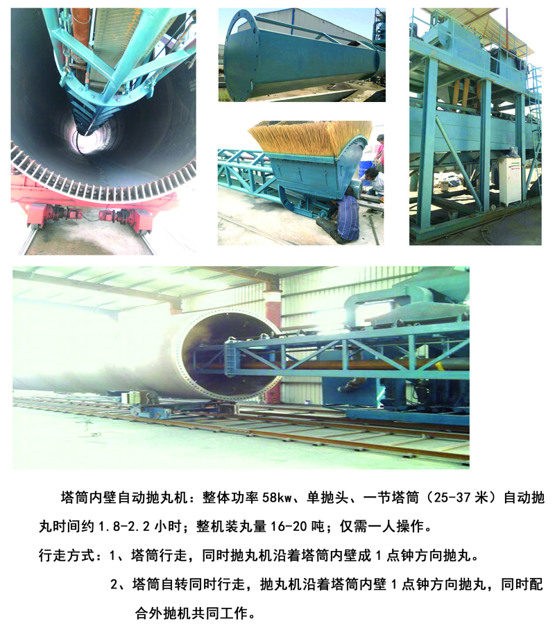 整體功率58KW、單拋頭、一節(jié)塔筒(25-37米)自動(dòng)拋丸時(shí)間約1.8-2.2小時(shí),整機(jī)裝丸量16-20噸;僅需一人操作。