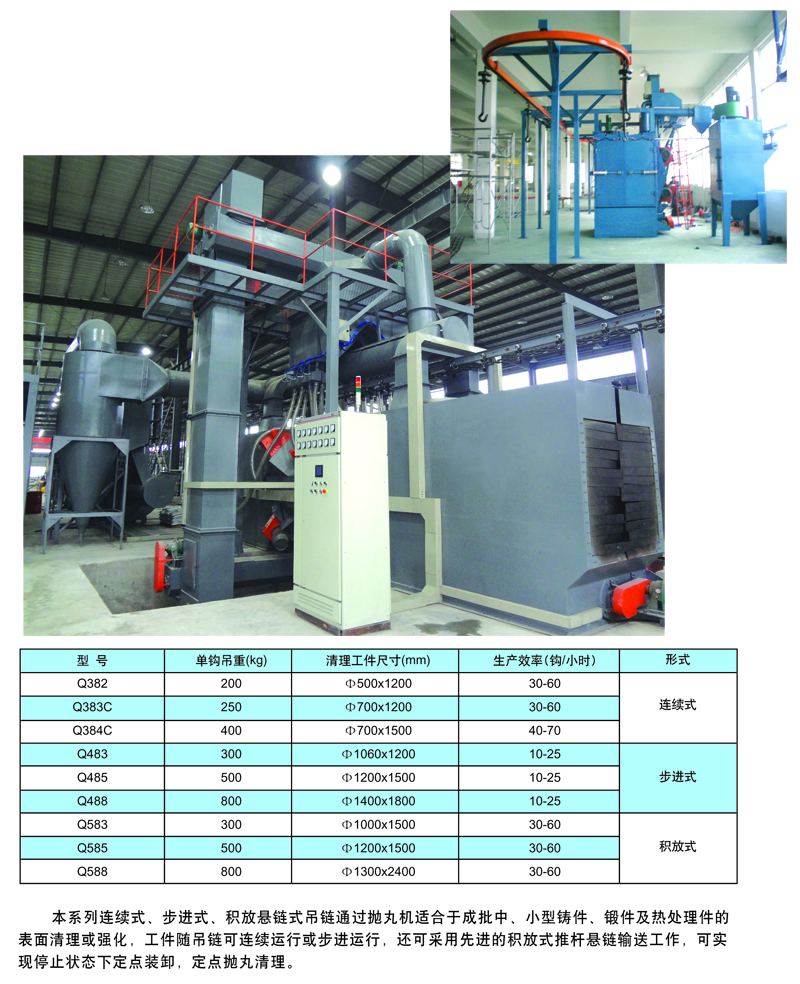 本系列連續(xù)式、步進式、積放懸鏈?zhǔn)降蹑溚ㄟ^拋丸機適用于成批中、小型鑄件、鍛件及熱處理件的表面清理或強化、工件隨吊鏈可連續(xù)運行或步進運行,還可采用先進的積放式推桿懸鏈輸送工作,可實現(xiàn)停止?fàn)顟B(tài)下定點裝缷,定點拋丸清理。