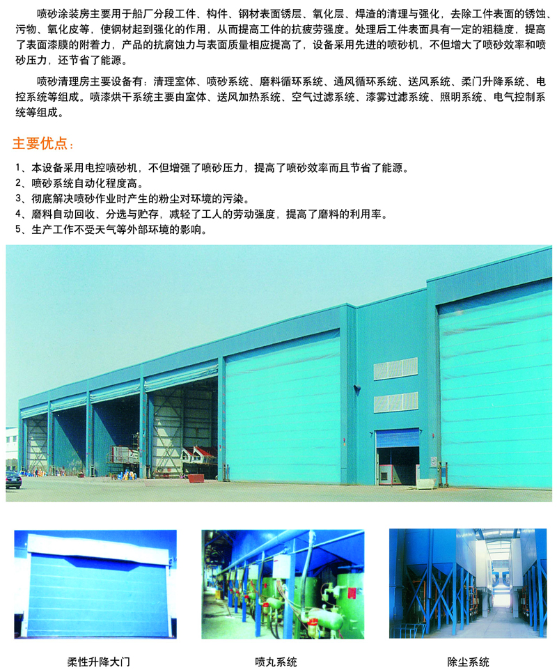噴砂涂裝房主要用于船廠分段工件、構(gòu)建、鋼材表面銹層、氧化層、焊渣的清理與強(qiáng)化,去除工件表面的銹蝕、污氧化皮等,使鋼材起到強(qiáng)化的作用,從而提高工件的抗疲勞強(qiáng)度。